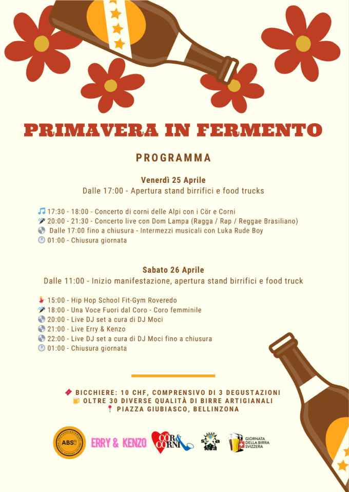 Nell'ambito dei festeggiamenti della Giornata della Birra Svizzera, l'Associazione Birrifici della Svizzera Italiana è lieta di annunciare "Primavera in fermento", evento che riunirà numerosi birrifici artigianali del nostro territorio per celebrare la qualità e la creatività della birra locale.